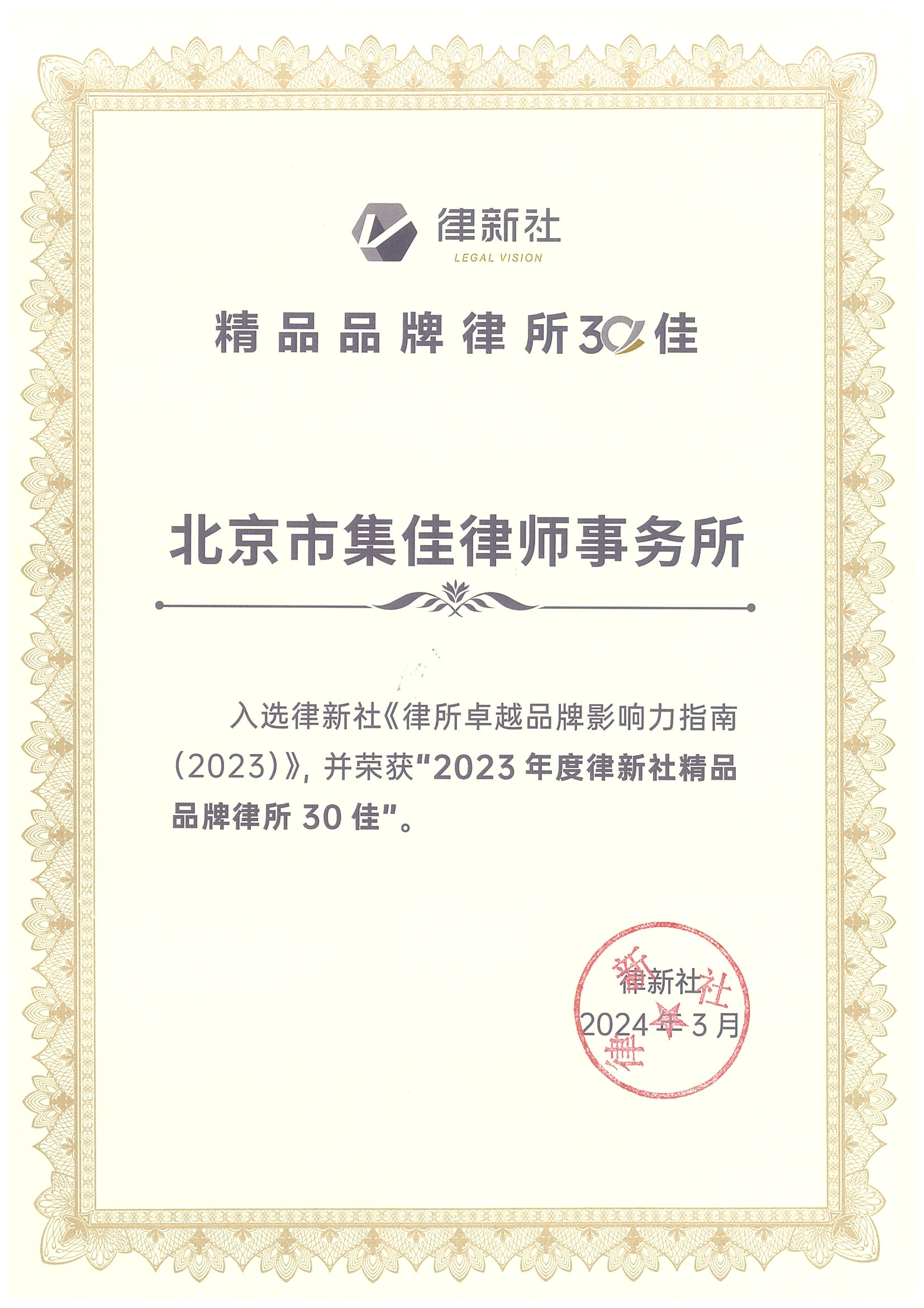 jrs入选 “2023年度律新社精品品牌律所30佳”
