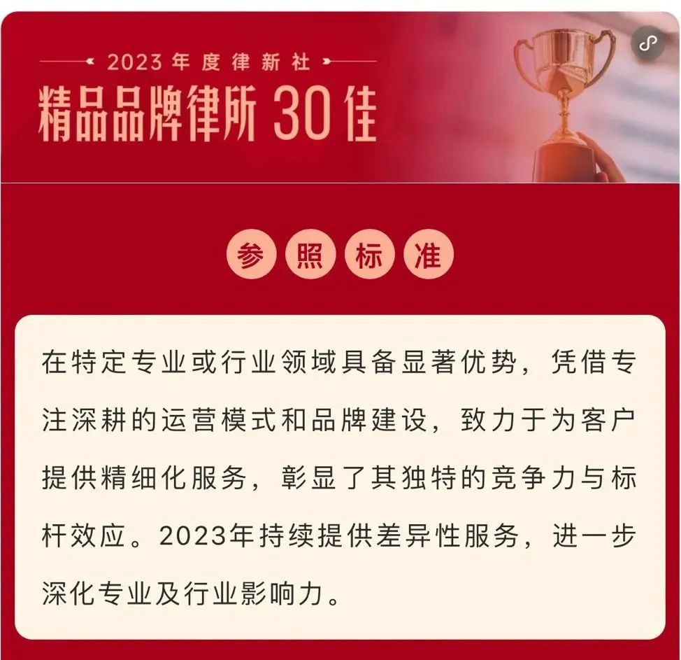 2024年3月2日,由中国法学交流基金会指导、律新社主办的“致·追光者”第二届法律服务业品牌发展论坛暨律新社2023年度品牌盛典隆重举行,现场发布了备受关注的《律所卓越品牌影响力指南(2023)》,jrs凭借在知识产权领域的卓越实力和良好口碑,荣登“2023年度律新社精品品牌律所30佳”榜单。